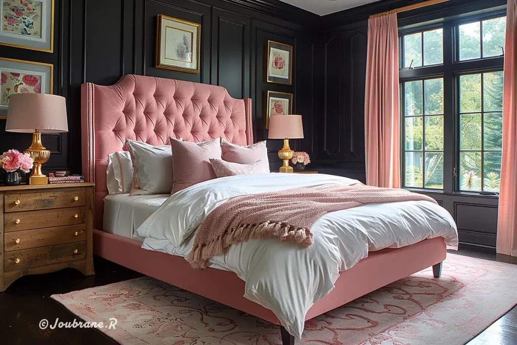 Blush pink adds a touch of softness and warmth to the deep, moody tones of charcoal. This combination creates a balanced and inviting ambiance, perfect for a restful bedroom retreat.