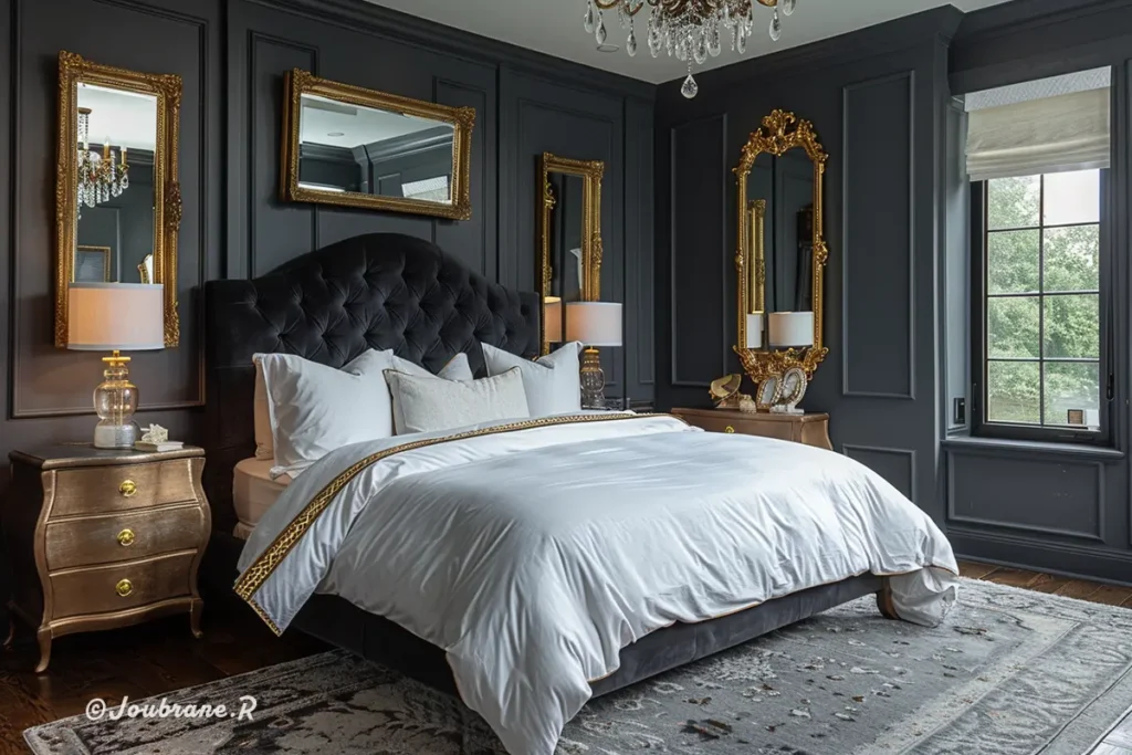 Gold accents bring a touch of luxury and glamour to a bedroom with charcoal walls. This combination exudes elegance and sophistication, perfect for a chic and stylish retreat.