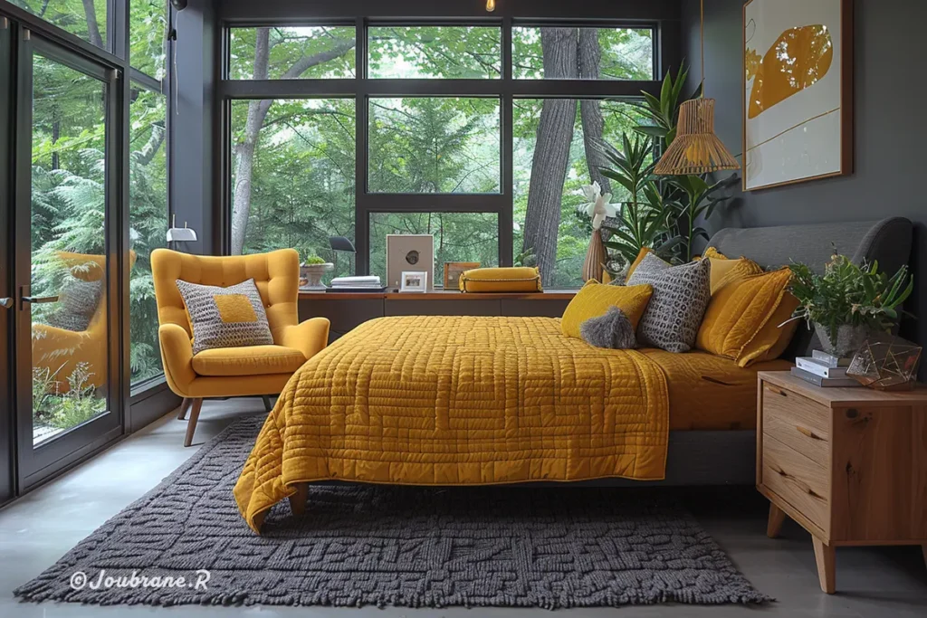 Mustard yellow injects a vibrant and energetic feel into a charcoal-themed bedroom. This bold combination is perfect for those who want to add a bit of sunshine to their sophisticated space.