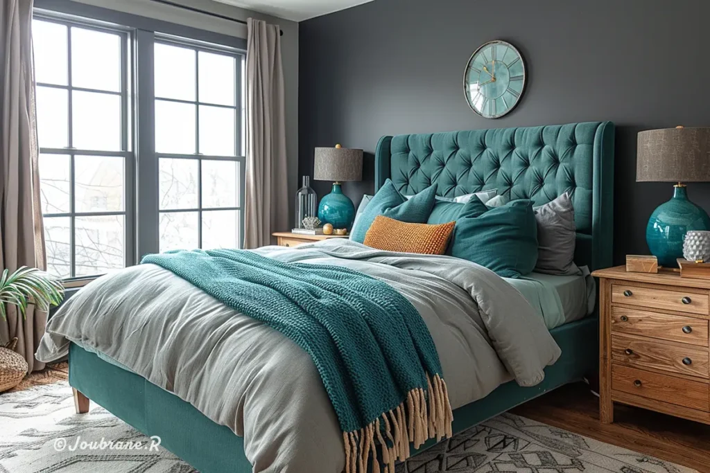 Teal provides a refreshing and calming contrast to charcoal. This combination is ideal for creating a tranquil and serene bedroom environment.